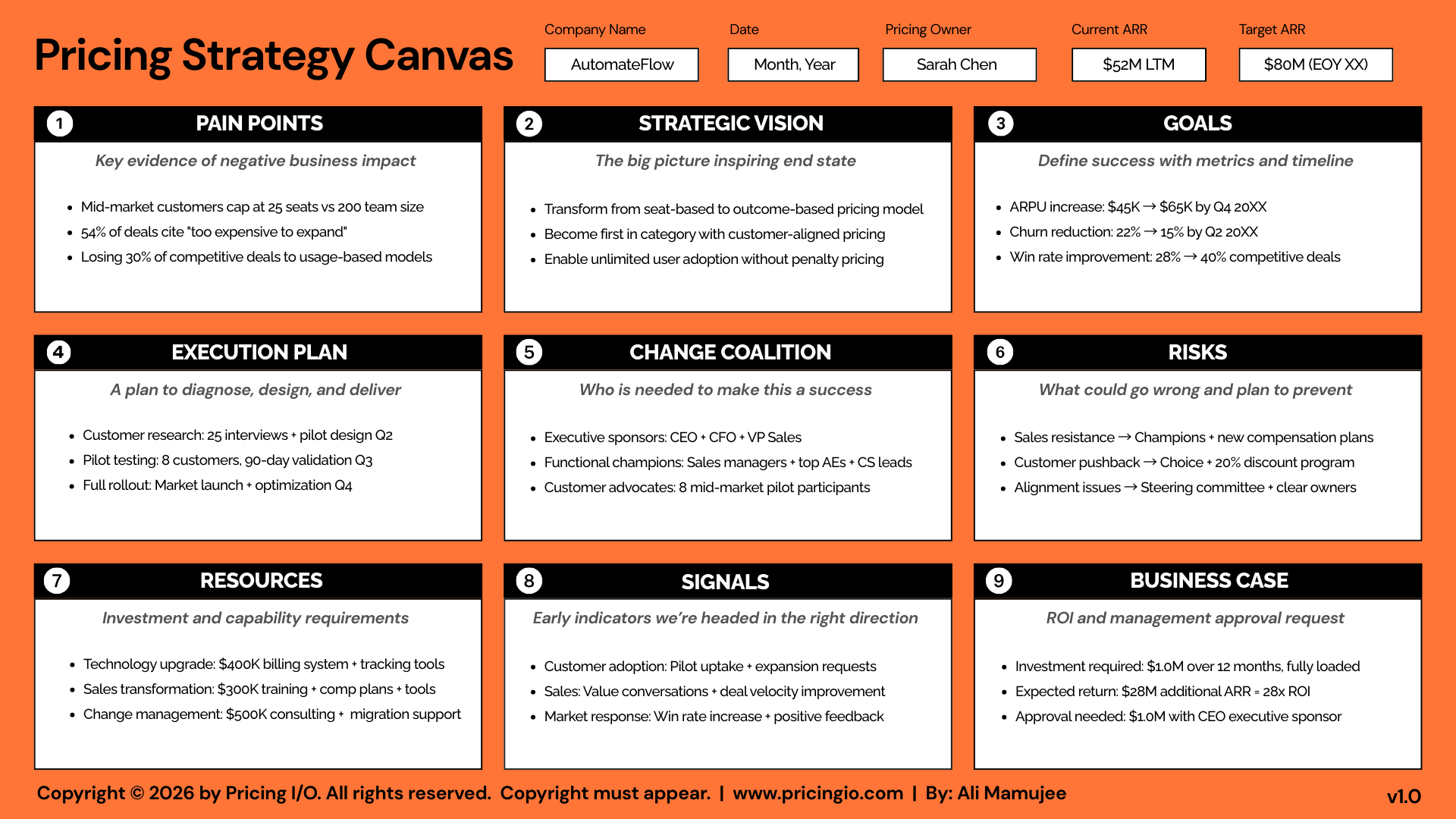 The Pricing Strategy Canvas is built to prevent that. It puts the concerns, plan, and ask in one place - so leadership can approve Phase 1 without guessing.